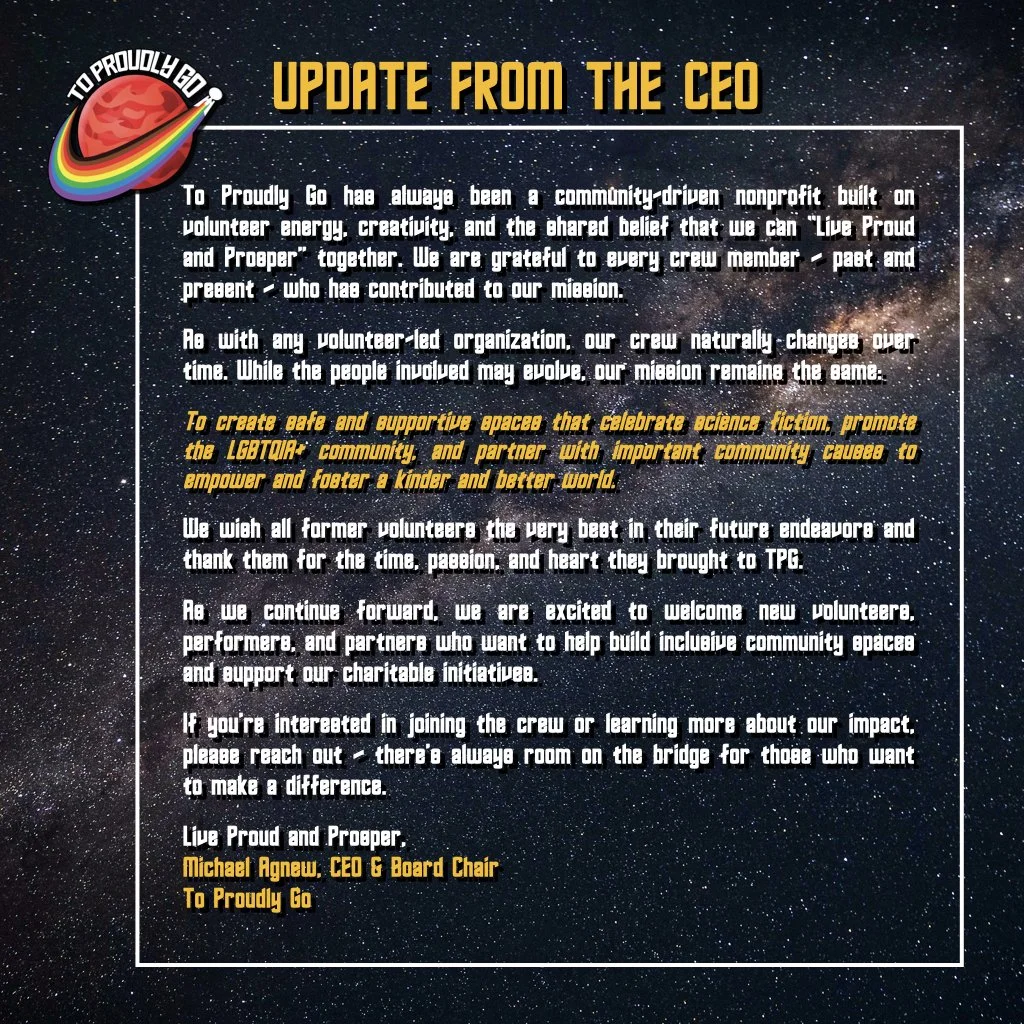 To Proudly Go is a 501(c)(3) nonprofit dedicated to building safe spaces for the LGBTQIA+ community through science-fiction–inspired events, drag performance, community engagement, and charitable giving.